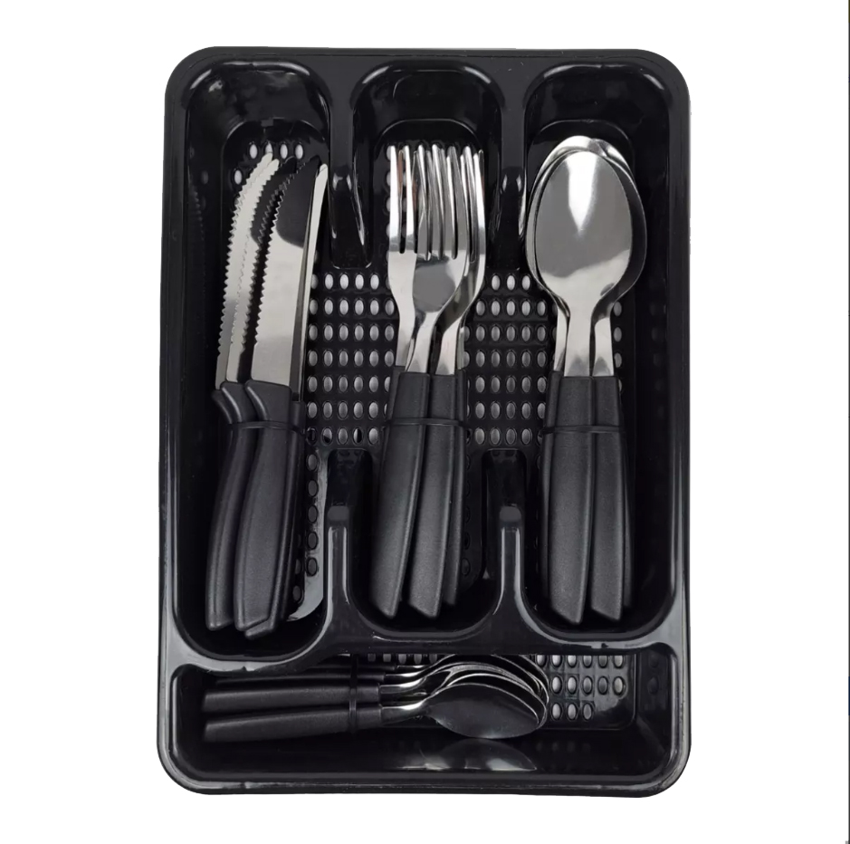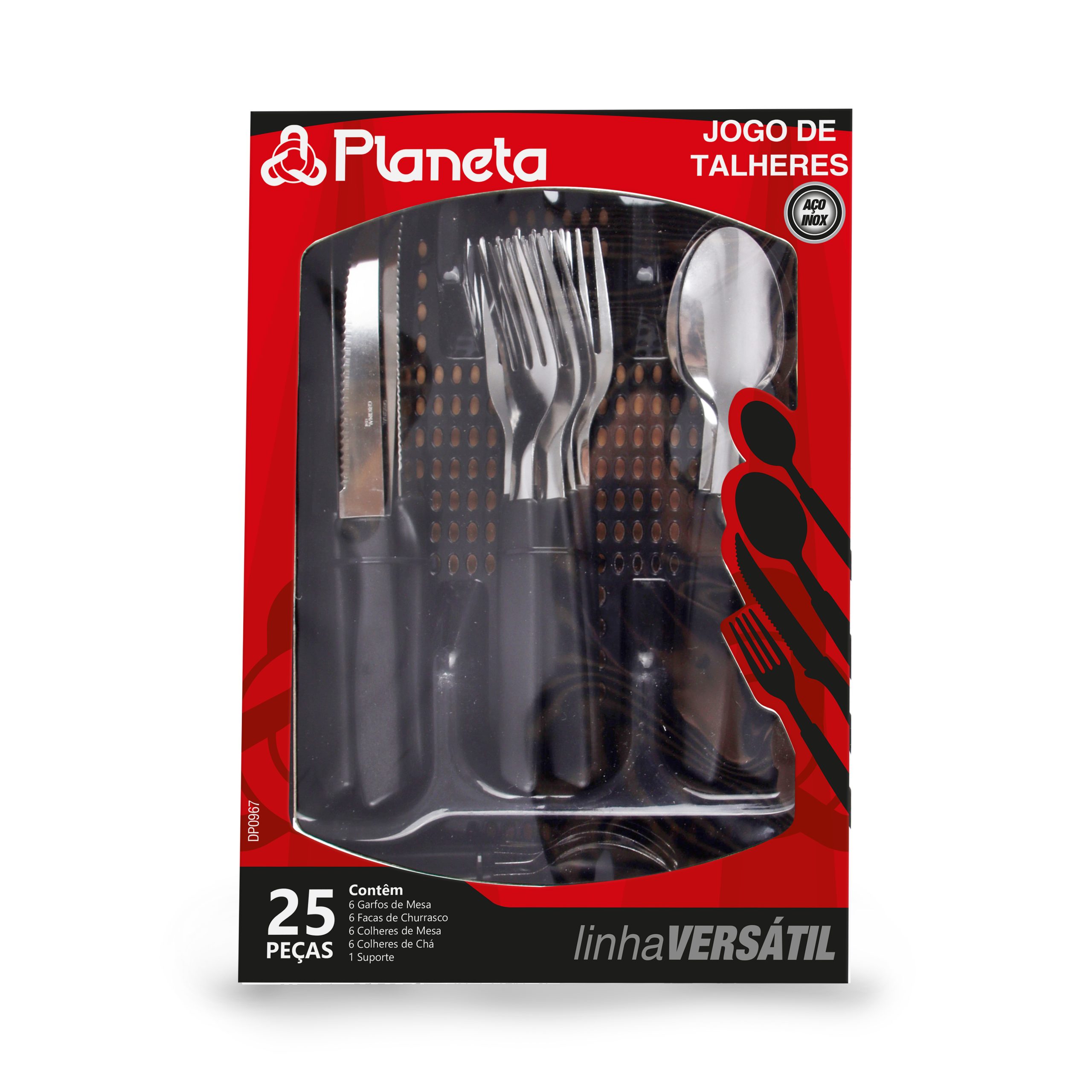 6 Garfos de Mesa 6 Facas de Churrasco 6 Colheres de Mesa 6 Colheres de Chá 1 Suporte
